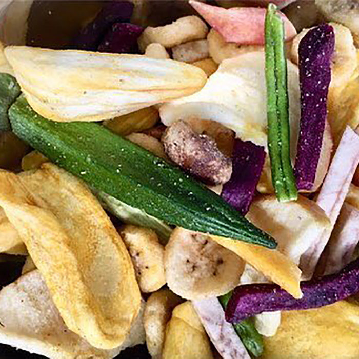 Crispy snack made of fruits and vegetables. No breading, no batter, no added carbs. Includes apples, jackfruit, bananas, green beans, okra, carrots, shiitake mushroom, purple sweet potato, taro.