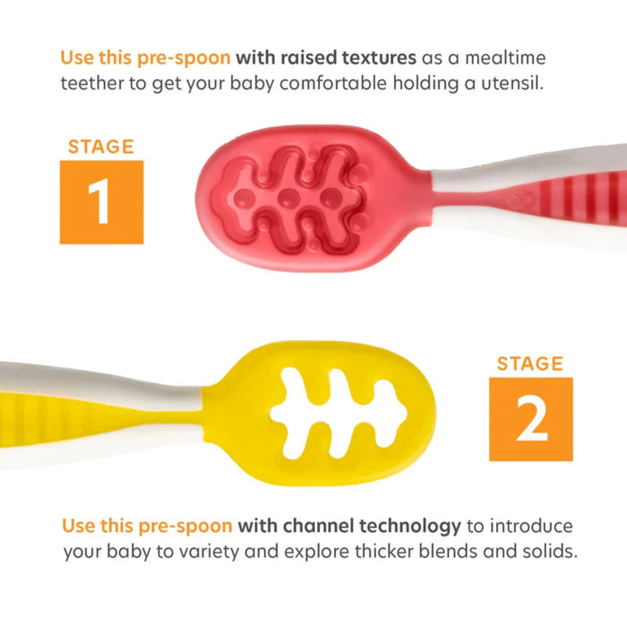 Introduce stage one pre-spoon (with raised textures) first so child can soothe their sore gums as they are getting acclimated to holding the utensil. Once the child has learned the basic food-to-mouth motion, the stage two pre-spoon, which holds more food, can be used interchangeably for thicker foods.