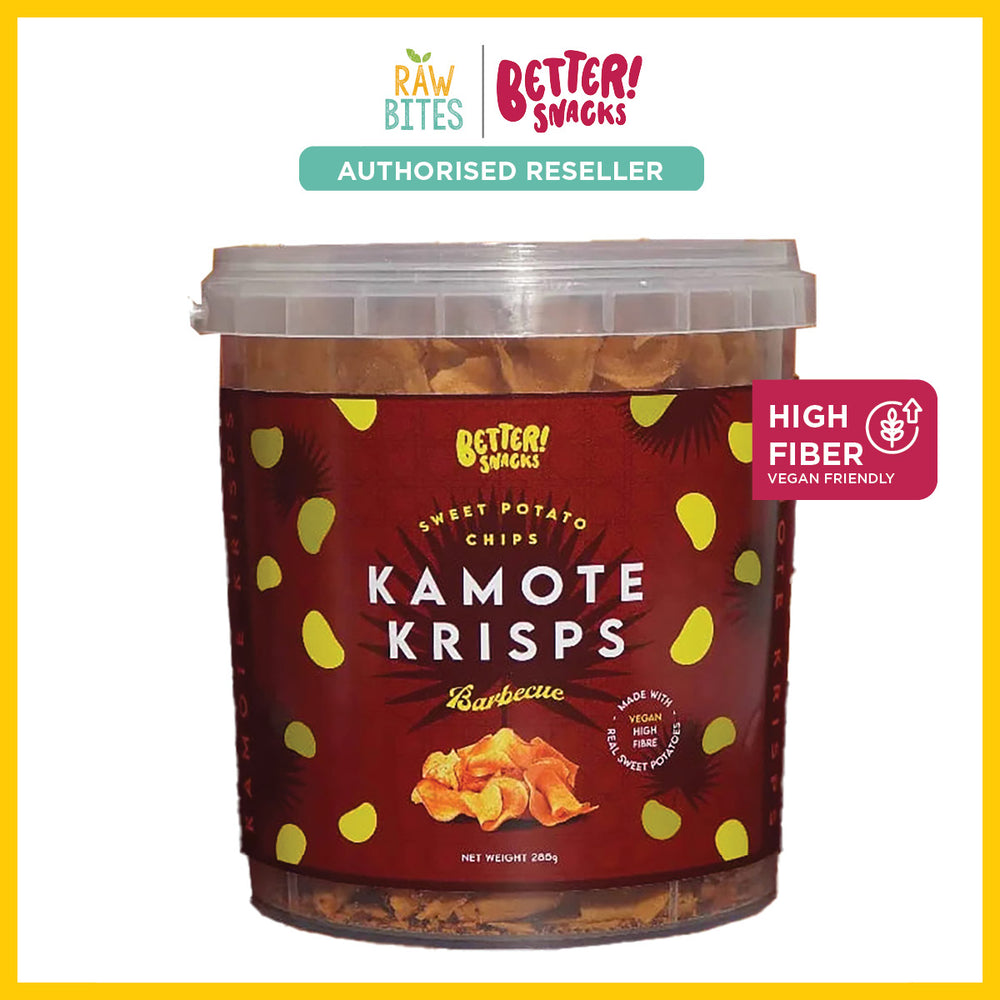 Crunchy Kamote (sweet potato) chips sprinkled with smoky barbecue powder to make for a high-fiber, not oily snack.