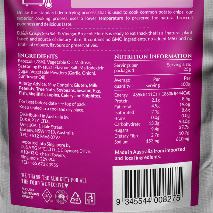 DJ&A Broccoli Florets Salt & Vinegar Veggie Chips 25g (All Natural, No Added MSG, No GMO)