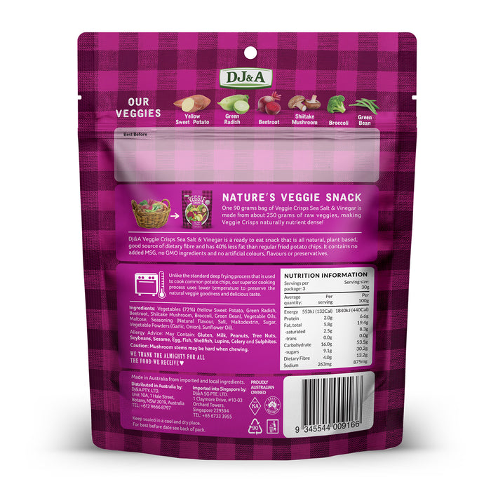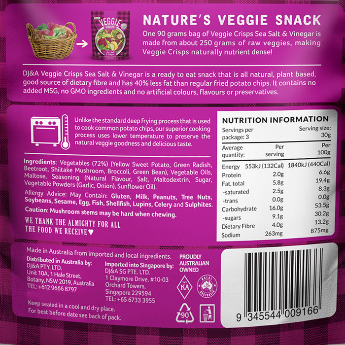 DJ&A is an Australian family business that was established in 2011. They saw that there were not many healthy and tasty products available to consumers. They wanted to change this. So they started experimenting with vegetables and fruit crisps and eventually created the Veggie Crisps and Fruity Crisps range.