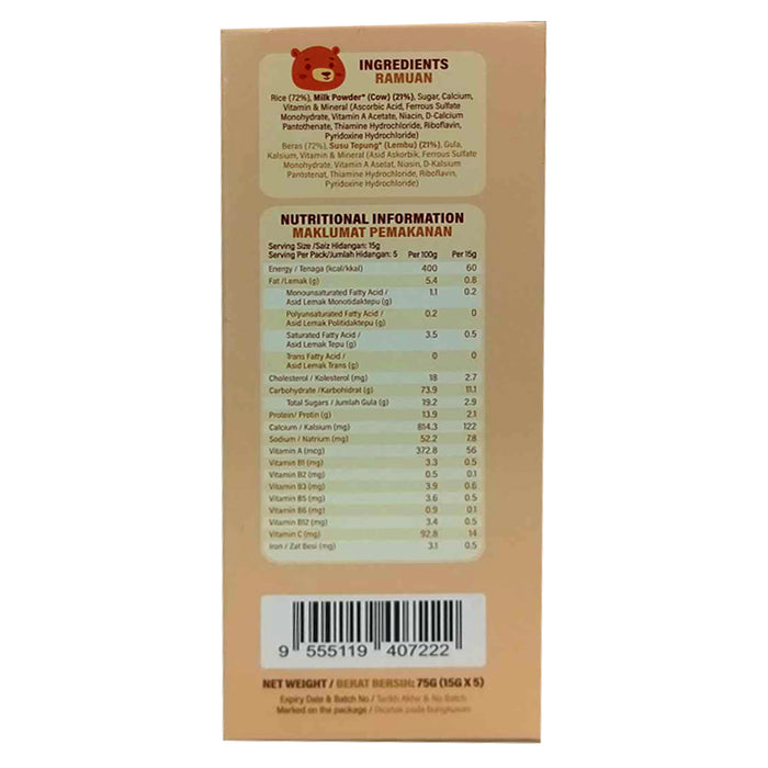 Rice, Milk Powder, Sugar, Calcium, Vitamins & Minerals (Ascorbic Acid, Ferrous Fumarate, Vitamin A Acetate, Niacin, D-Calcium Pantothenate, Thiamine Hydrochloride, Riboflavin)