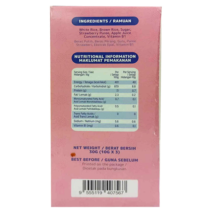 White Rice, Brown Rice, Sugar, Strawberry Puree, Apple Juice Concentrate, Vitamin B1
