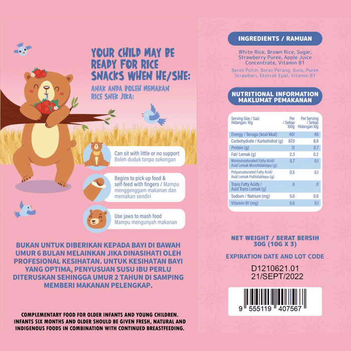 Happiemama Baby Snack Strawberry Rice Snack [3 packs x 10g] [6mos+] (Allergen Friendly, No Added Salt)