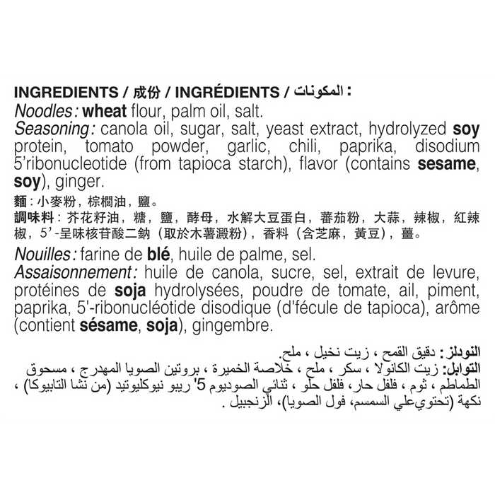 Seasoning: Canola Oil, Sugar, Salt, Yeast Extract, Hydrolyzed Soy Protein, Tomato Powder, Garlic, Chili, Paptrika, Disodium 5'ribonucleotide (from tapioca starch), Flavour (contains sesame, soy), Ginger