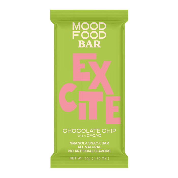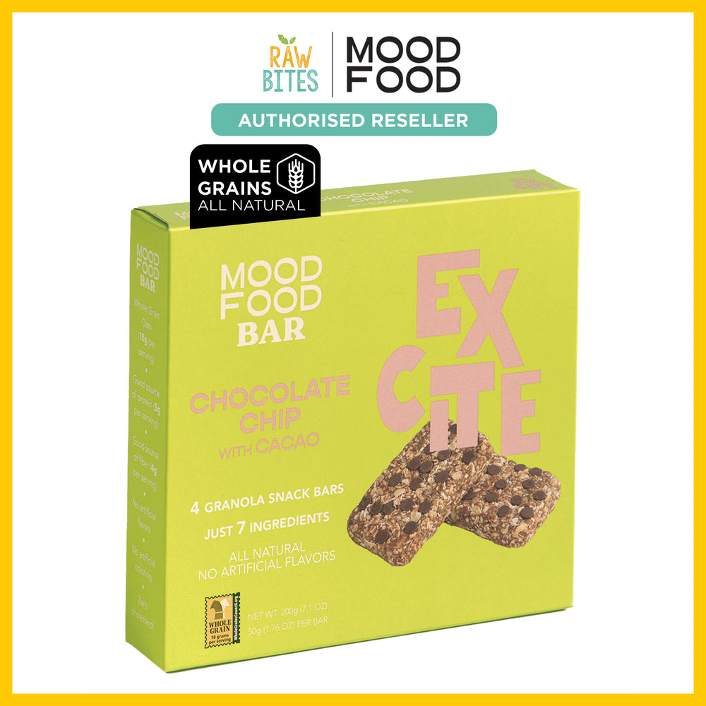 Mood Food Bar Excite - Chocolate Chip with Cacao [4 x 50g] (All Natural, No Refined Sugar, Whole Grains)