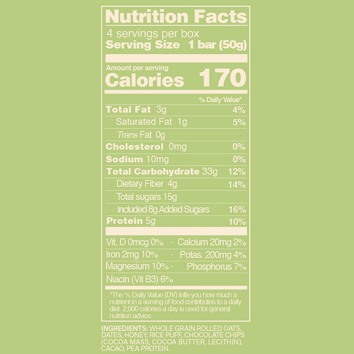 Whole Grain Rolled Oats, Dates, Honey, Rice Puff, Chocolate Chips (Cocoa Mass, Sugar, Cocoa Butter, Lecithin, Cacao, Pea Protein)
