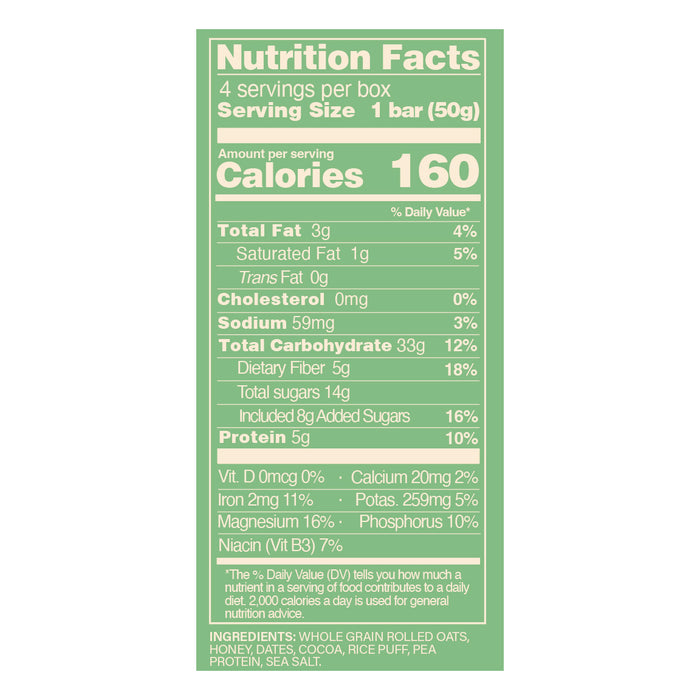 Whole Grain Rolled Oats, Honey, Dates, Cocoa, Rice Puff, Pea Protein, Sea Salt