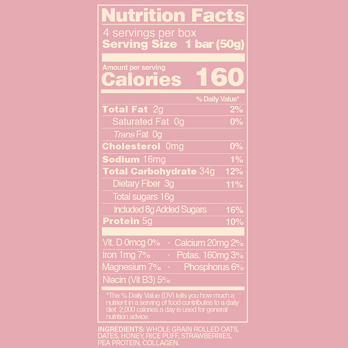 Whole Grain Rolled Oats, Dates, Honey, Rice Puff, Strawberries, Pea Protein, Collagen