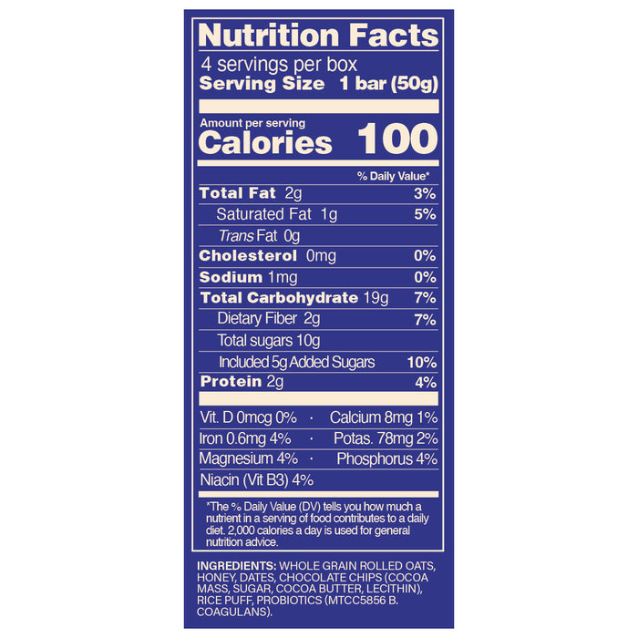 Whole Grain Rolled Oats, Honey, Dates, Chocolate Chips (Cocoa Mass, Sugar, Cocoa Butter, Lecitihin), Rice Puff, Probiotics