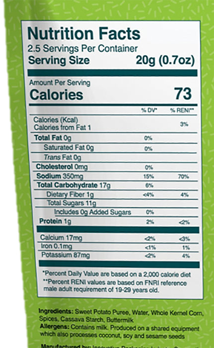 Sweet Potato Puree, Water, Whole Kernel Corn, Spices, Cassava Starch, Buttermilk