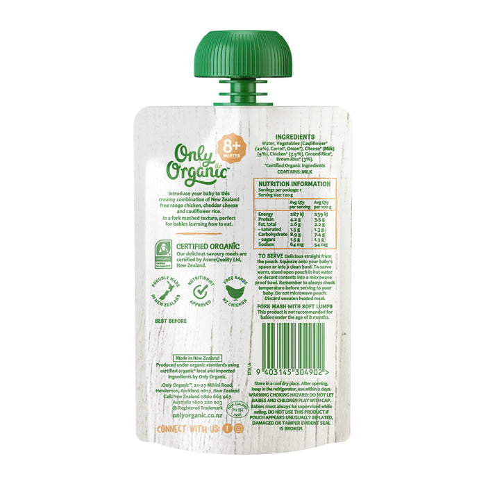 Only Organic Baby Food Chicken Cheddar Cheese Cauliflower Rice 120g [8 mos+] (Organic, Nutritionist Approved, Source of Protein)