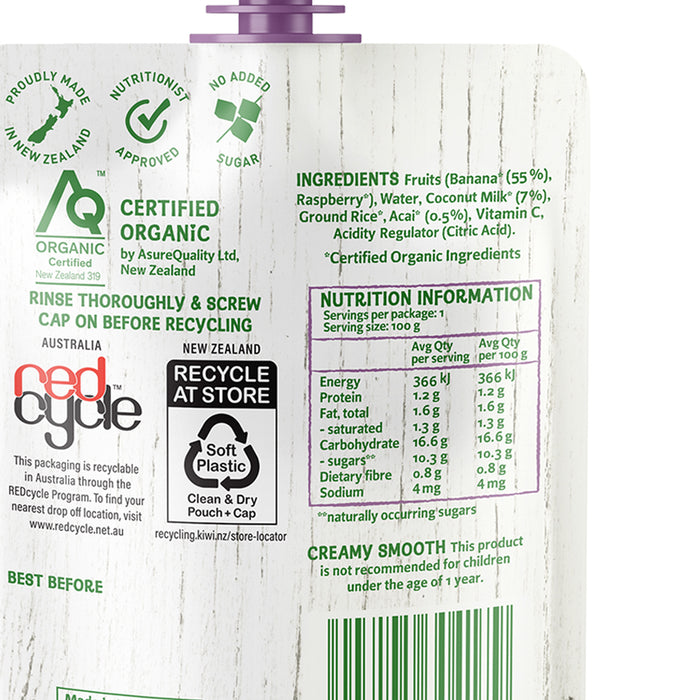 Fruits (Banana* (55%), Raspberry*), Water, Coconut Milk* (7%), Ground Rice*, Acai* (0.5%), Vitamin C (Ascorbic Acid), Acidity Regulator (Citric Acid)