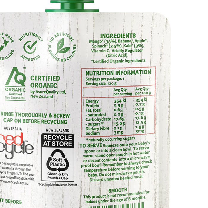 Introduce your baby to leafy greens with this smooth blend of organic kale, spinach and delicious mango, in a fork mashed texture, perfect for babies learning how to eat.