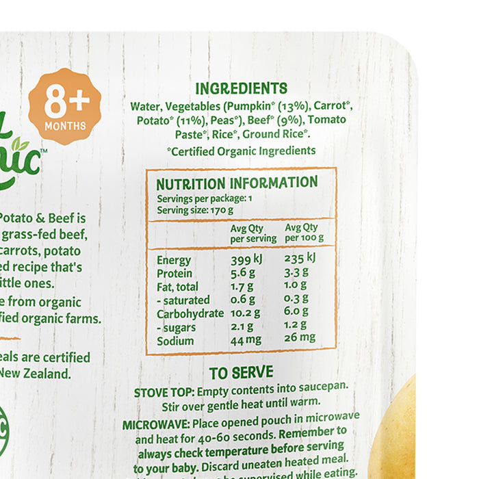 This nourishing meal is made with New Zealand grass-fed beef, pumpkin, carrots, potato and peas. It's tasty dish to tempt your little one and the fork-mashed texture is perfect for babies who are learning how to chew. Serve warm for lunch or dinner.