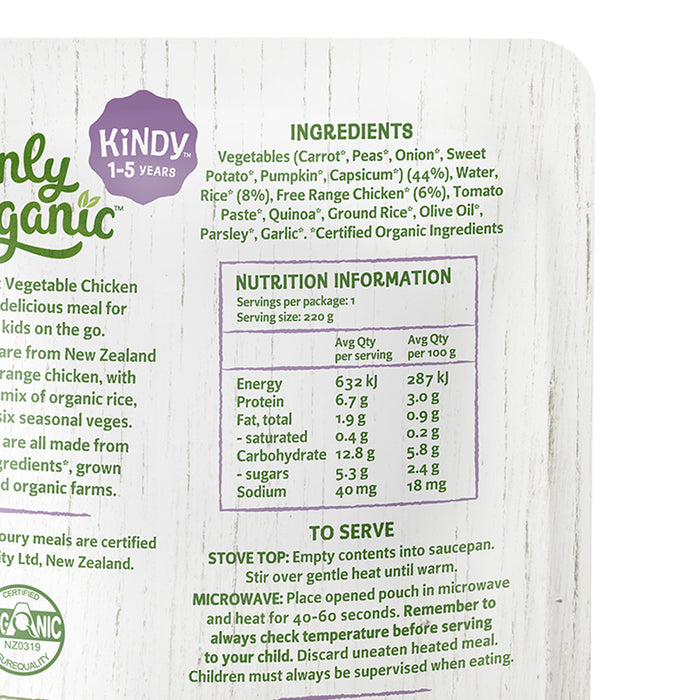 Only Organic Vegetable Chicken Risotto is a delicious meal for growing kids on the go. It's made with care from New Zealand organic free range chicken, with a nourishing mix of organic rice and six seasonal veggies. Our recipes are all made from organic ingredients, grown on certified organic farms.