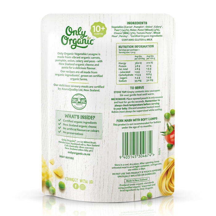 Only Organic Baby Food Vegetable Lasagne 170g [10 mos+] (Organic, Nutritionist Approved)