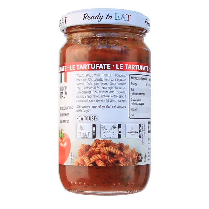 Tomato Pulp 62%, Cultivated Mushroom (Agaricus Bisporus), Truffle Juice (water, Tuber Aestivum Vitt), Sunflower Oil, Extra Virgin Olive Oil, Summer Truffle (Tuber Aestivum Vitt) 3%, Onion, Salt, Natural Flavour, Flavouring, Sunflower Lecithin, Garlic