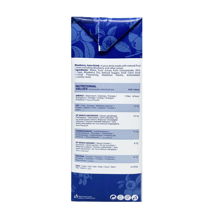 Ingredients: Water, Fruit Juices from Concentrates 20% (Grape , Blueberry 2%), Natural Sugars, Acid: Citric Acid, Natural Flavouring, Stabiliser: Pectin, Antioxidant: Ascorbic Acid