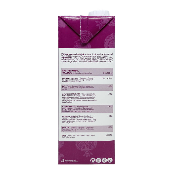 Ingredients: Water, Fruit Juices from Concentrates 17% (Pomegranate 7%, Aronia Berries, Apple), Natural Sugars, Natural Flavouring, Acid: Citric Acid, Antioxidant: Ascorbic Acid