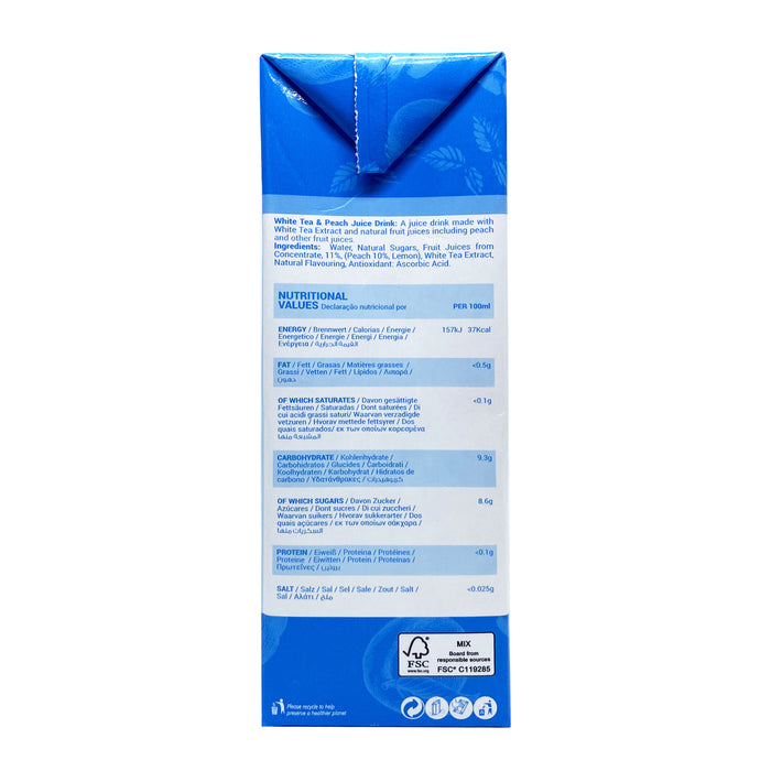 Ingredients: Water, Natural Sugars, Fruit Juices from Concentrate 11% (Peach 10%, Lemon), White Tea Extract, Natural Flavouring, Antioxidant: Ascorbic Acid