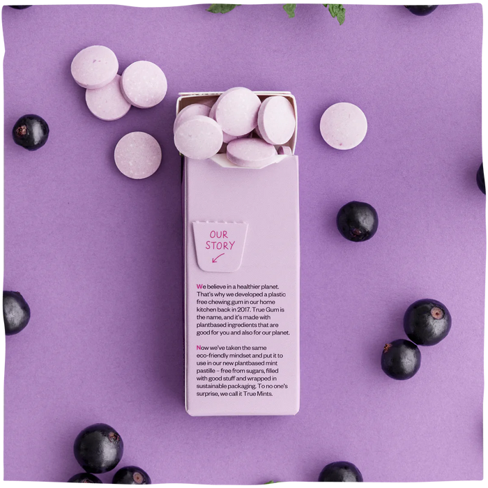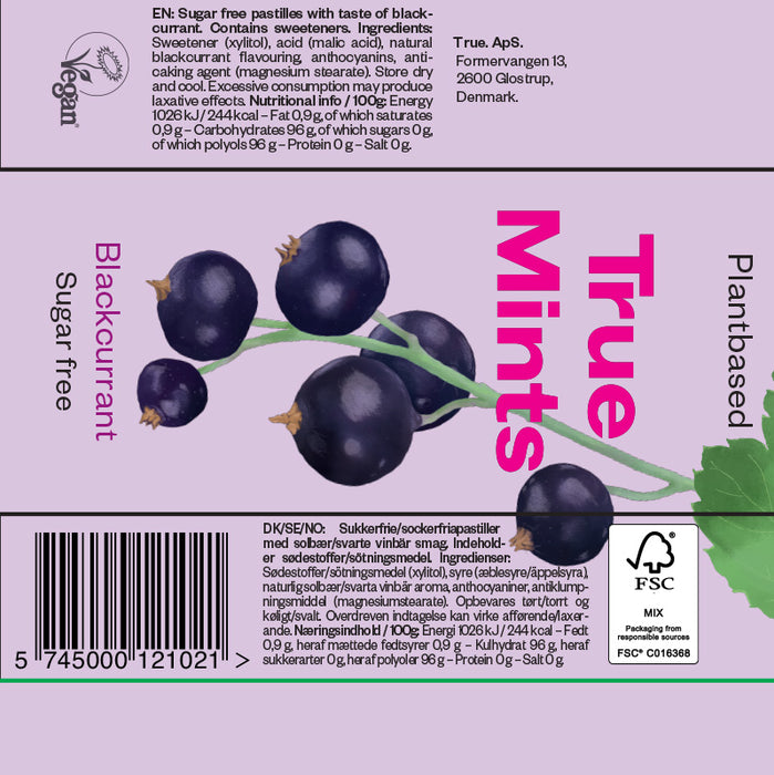 Sweeteners (Xylitol), acid (apple cider), natural blackcurrant aroma, anthocyanins, anti-caking agent (magnesium stearate)